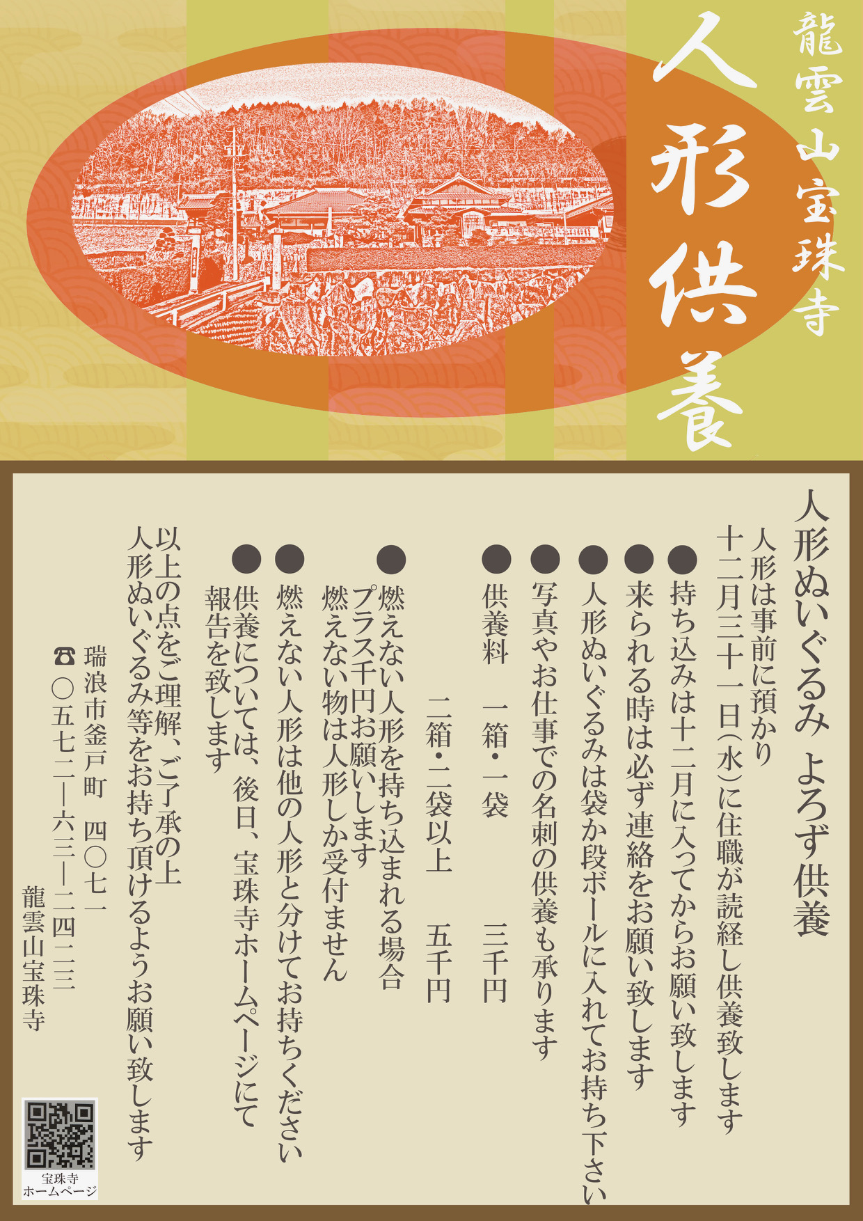 年末の人形供養 2025 12/07 行事の様子 2025年12月7日 ポスターのように人形供養を行います。 今年は写真のアルバムなど実家のお片付けでお持ちになられた方も見えます。 お困りの方などはご連絡下さい。 行事の様子 よかったらシェアしてね! URLをコピーしました! URLをコピーしました! 令和7年11月29日18時半 宝珠寺ジャズライブ 除夜の鐘 この記事を書いた人 森 照倫 関連記事 4月12日(日) お子安さま・人形供養 2026年1月25日 令和8年1月11日宝珠寺大般若祈禱会 2026年1月13日 除夜の鐘と人形供養 2026年1月1日 令和7年11月29日18時半 宝珠寺ジャズライブ 2025年10月9日 令和7年7月12日宝珠寺盆施餓鬼会 2025年7月16日 7月12日(土)宝珠寺盆施餓鬼会のお知らせ 2025年7月4日 令和7年4月20日人形供養 2025年4月22日 令和7年4月20日(日)お子安さま祭礼・人形供養 2025年2月26日 コメント コメントする コメントをキャンセルコメント ※ 名前 ※ メール ※ サイト 上に表示された文字を入力してください。